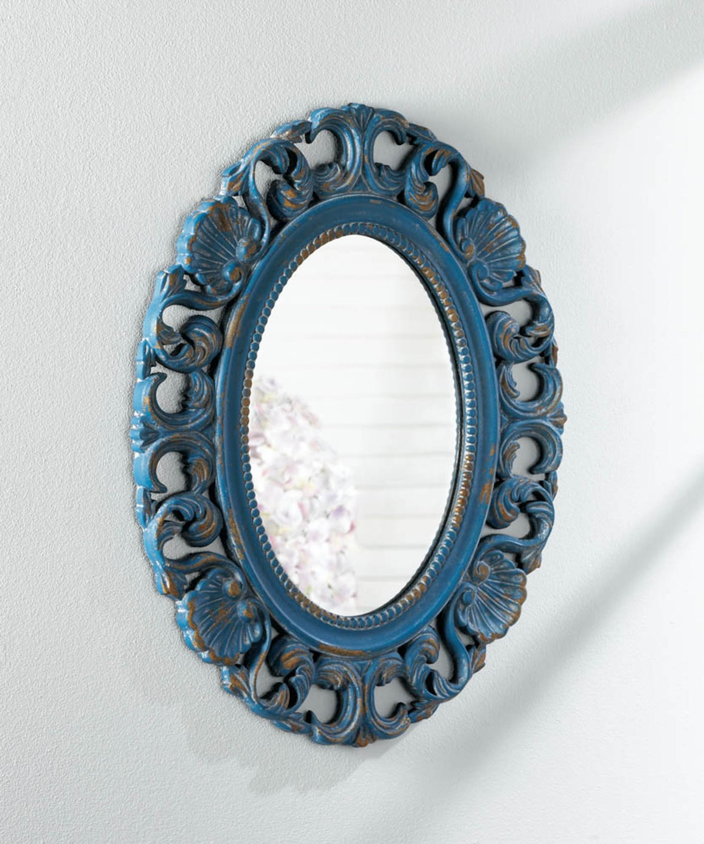 • Seashells and ornately carved waves surround this oval mirror with a splash of vintage charm. The wooden frame features a weathered blue finish that makes this wall-mounted mirror stand out in any room of your home. A great housewarming gift or personal home décor piece!